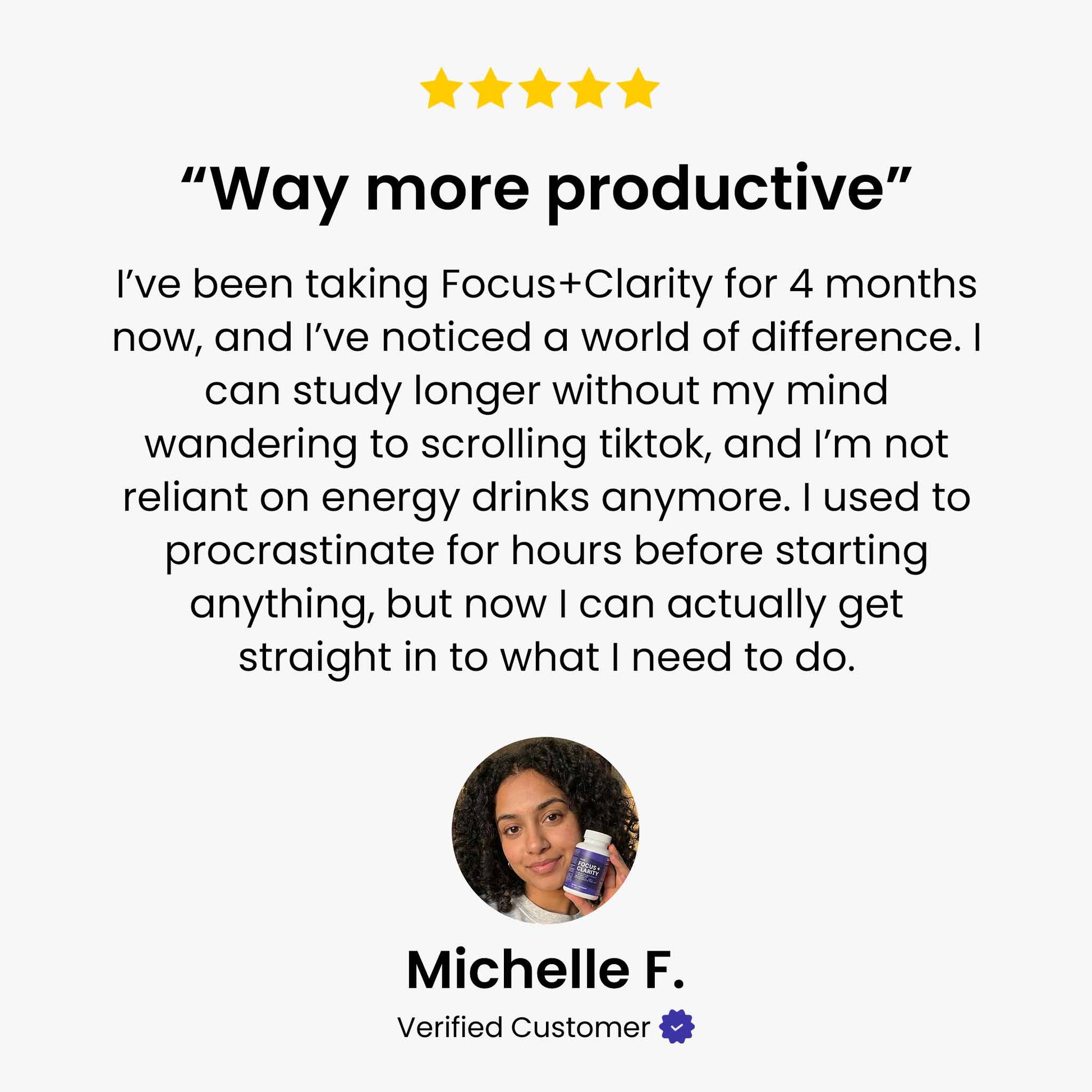 FOCUS + CLARITY is formulated to maximize your mental clarity, focus, and cognitive performance. Our clinically-backed stacks deliver natural crash-free energy and enhanced mental clarity you need to solve harder problems, think faster, and get more done without prescription focus pills or stimulants.