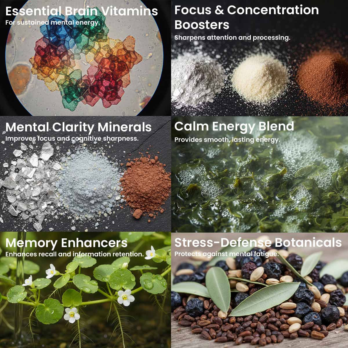 FOCUS+CLARITY is a powerful synergistic blend built on clinically-proven compounds that work: Bacopa for memory, GABA for calm focus, and DMAE for sustained alertness. We give you a clear advantage by optimizing the actual chemical pathways in your brain, without adding stimulants.